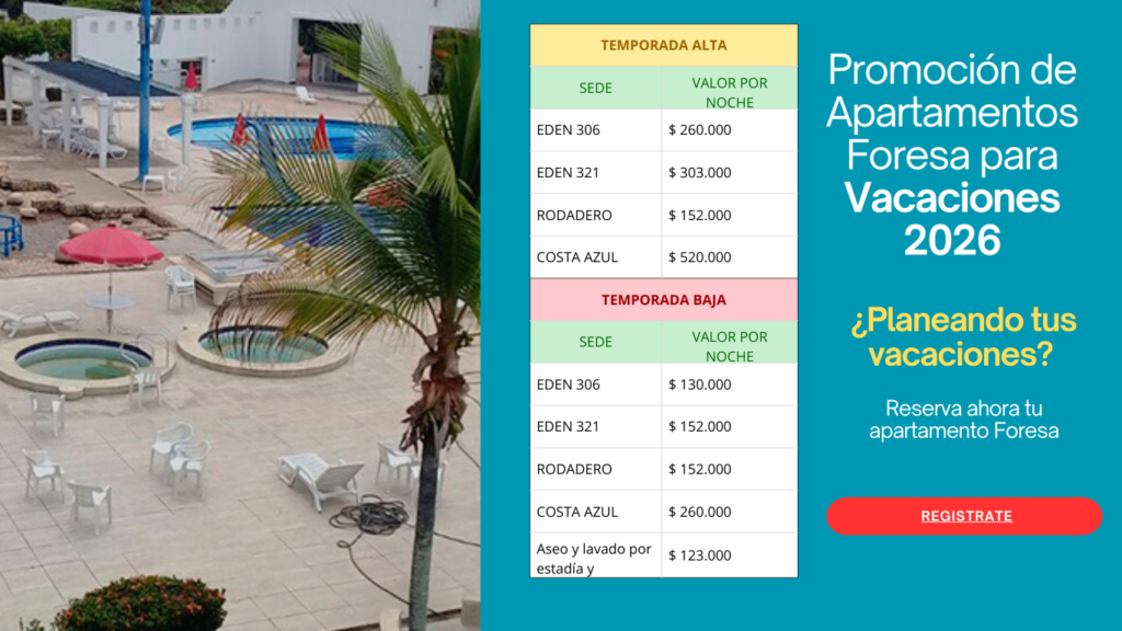 La Gerencia de Recreación y Bienestar Social de la Asociación de Ingenieros de ETB-FORESA, se permite informar las fechas de DISPONIBILIDAD de los apartamentos del día 10 de ENERO/26 al 28 de FEBRERO/26, en caso de estar interesado en la utilización favor diligenciar en su totalidad el formulario adjunto y remitir al correo: foresa.asiet@gmail.com, o administracion.asiet@gmail.com, Se adjudicará en el orden de recibo.